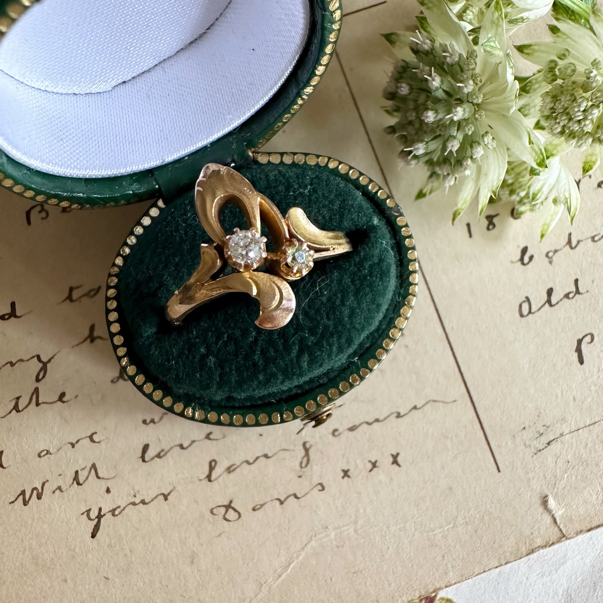 また、アールヌーヴォーのリングは、他のスタイルに比べて、より個性的で自由な造形が特徴です。流れるようなラインや自然界のモチーフ(例えば植物や昆虫)を細かく取り入れたデザインは、当時としても前衛的であったため、他のジュエリーと比べて作られた量が少ないと考えられます。こうした点で、アールヌーヴォーのリングは非常に希少で、見つけるのが難しいこともありますが、その独特の美しさがあるため、コレクターやアンティークジュエリーファンには非常に人気があります。