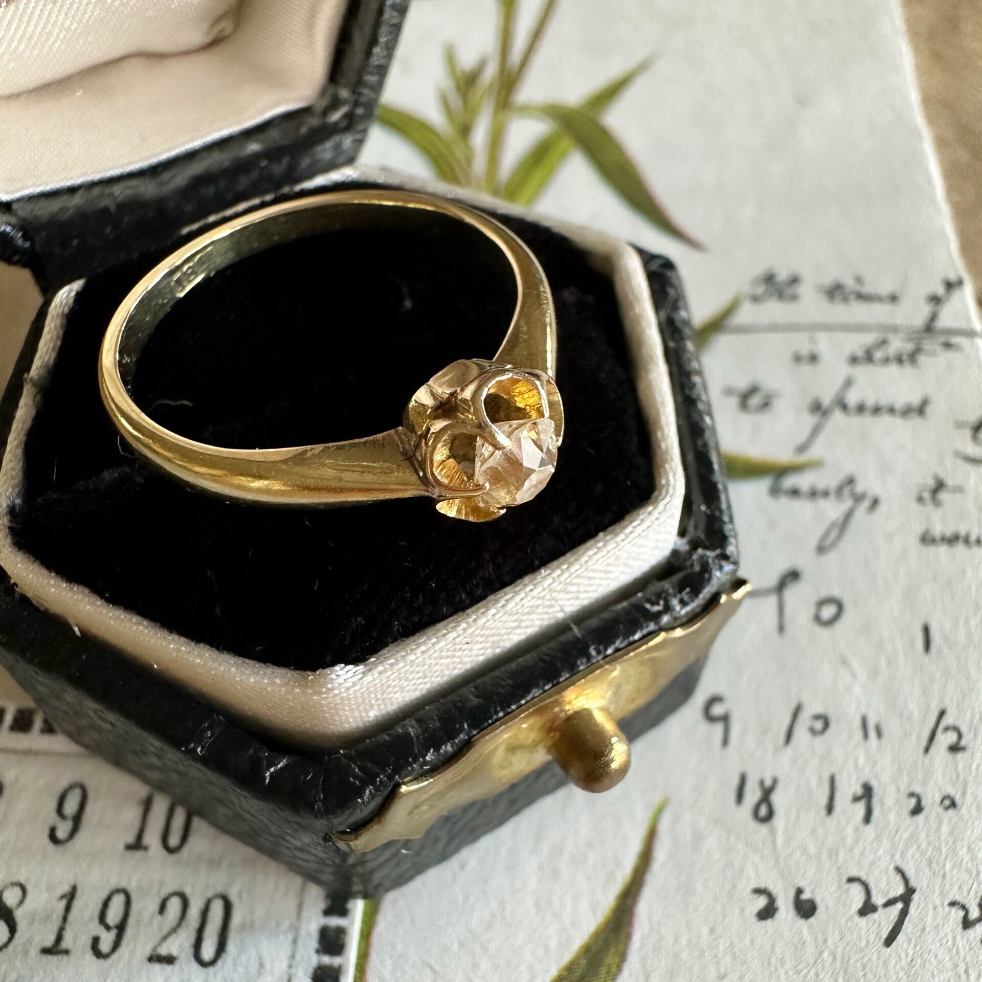 この愛らしい18金イエローゴールドのリングは、オールドマインカットダイヤモンドをバターカップセッティングで優しく包み込んだひと品。