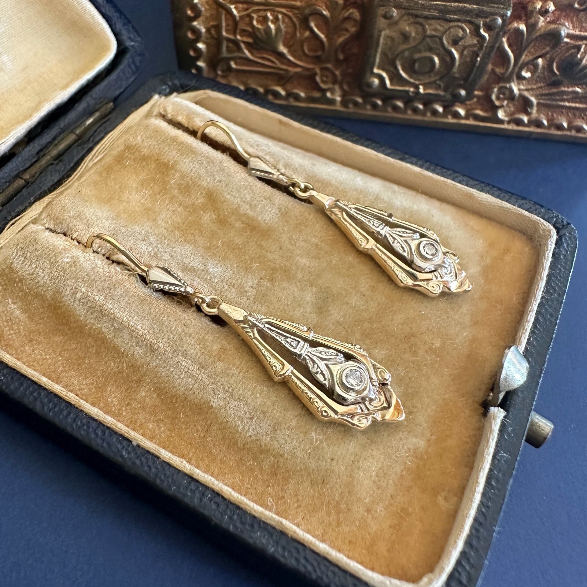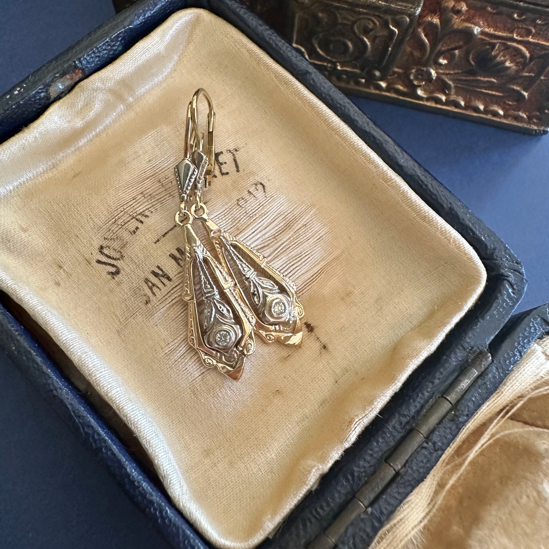 イエローゴールドとホワイトゴールドが巧みに組み合わさり、ピアス全体に立体感と艶めきが生まれ、優美さを際立たせています。ピアスの下部に向かって広がるシルエットと細部に施された彫刻のコンビネーション、そこにセットされたダイヤモンド、他にはない独自の個性を感じさせるひと品です。