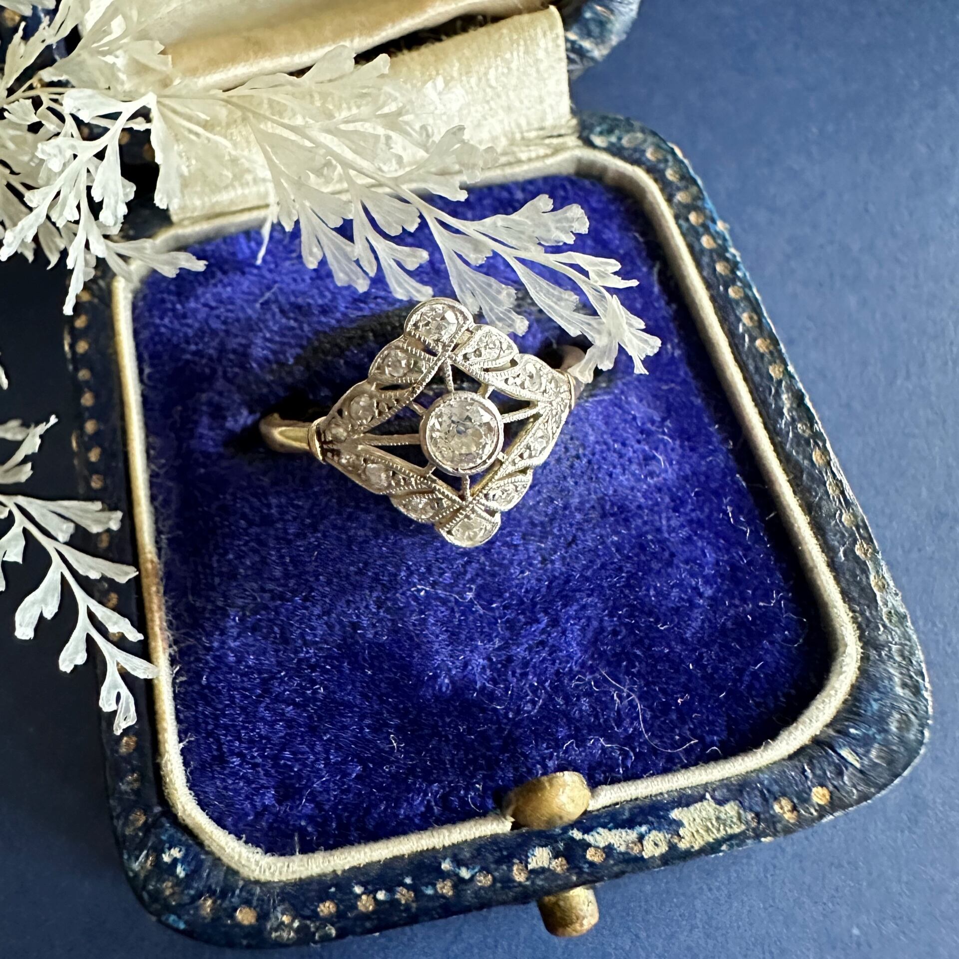 このベルエポック期のダイヤモンドアンティークリングは、その時代特有の優美さと繊細な技巧が凝縮された美しいひと品。