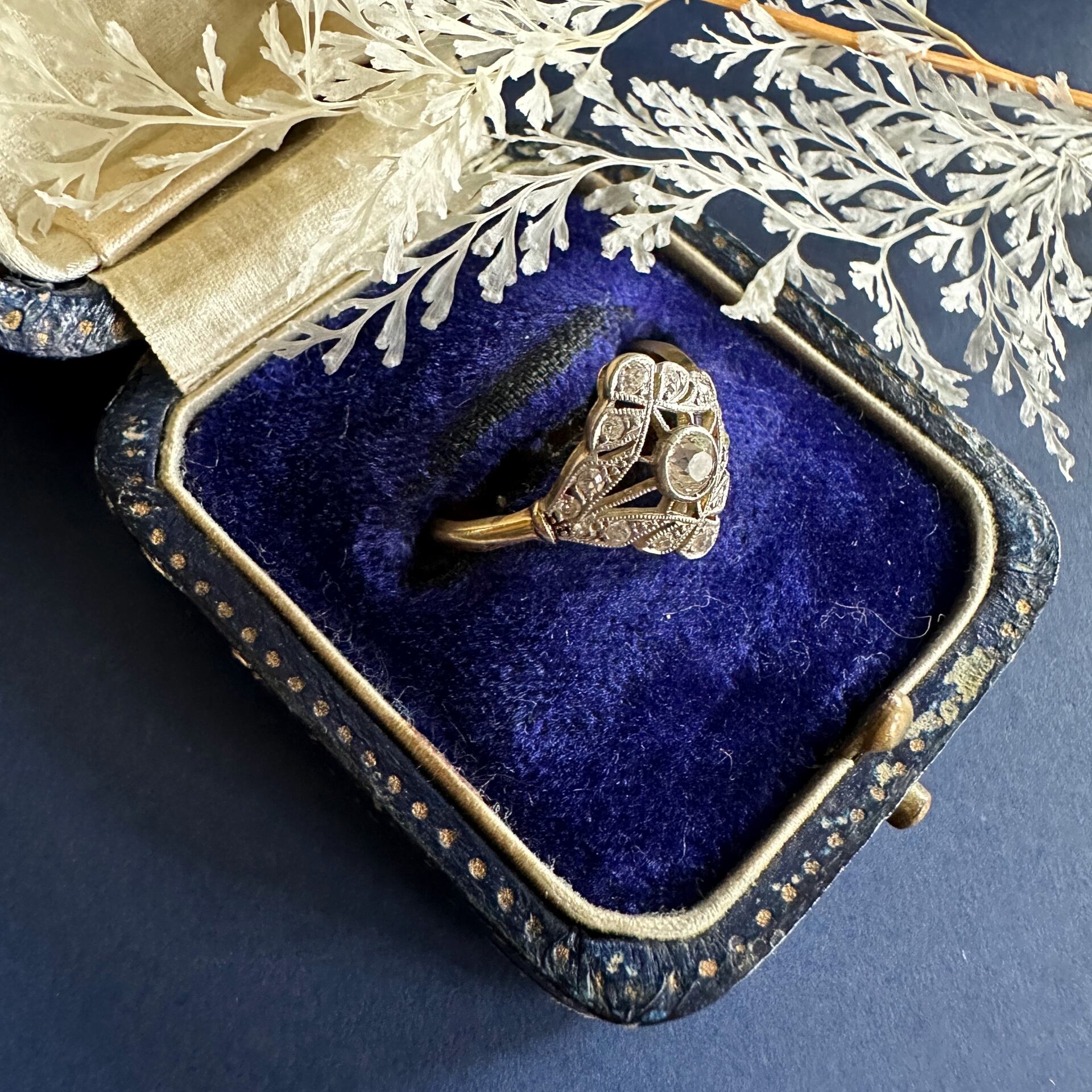 特に、当時のファッションでは自然を模したデザインが人気を集め、アールヌーボーの影響を受けたジュエリーはその象徴でした。このリングに見られる葉のモチーフは、自然の美しさを反映したもので、繊細でありながらも大胆なデザインが当時の女性たちのドレスをより一層引き立てた事でしょう。