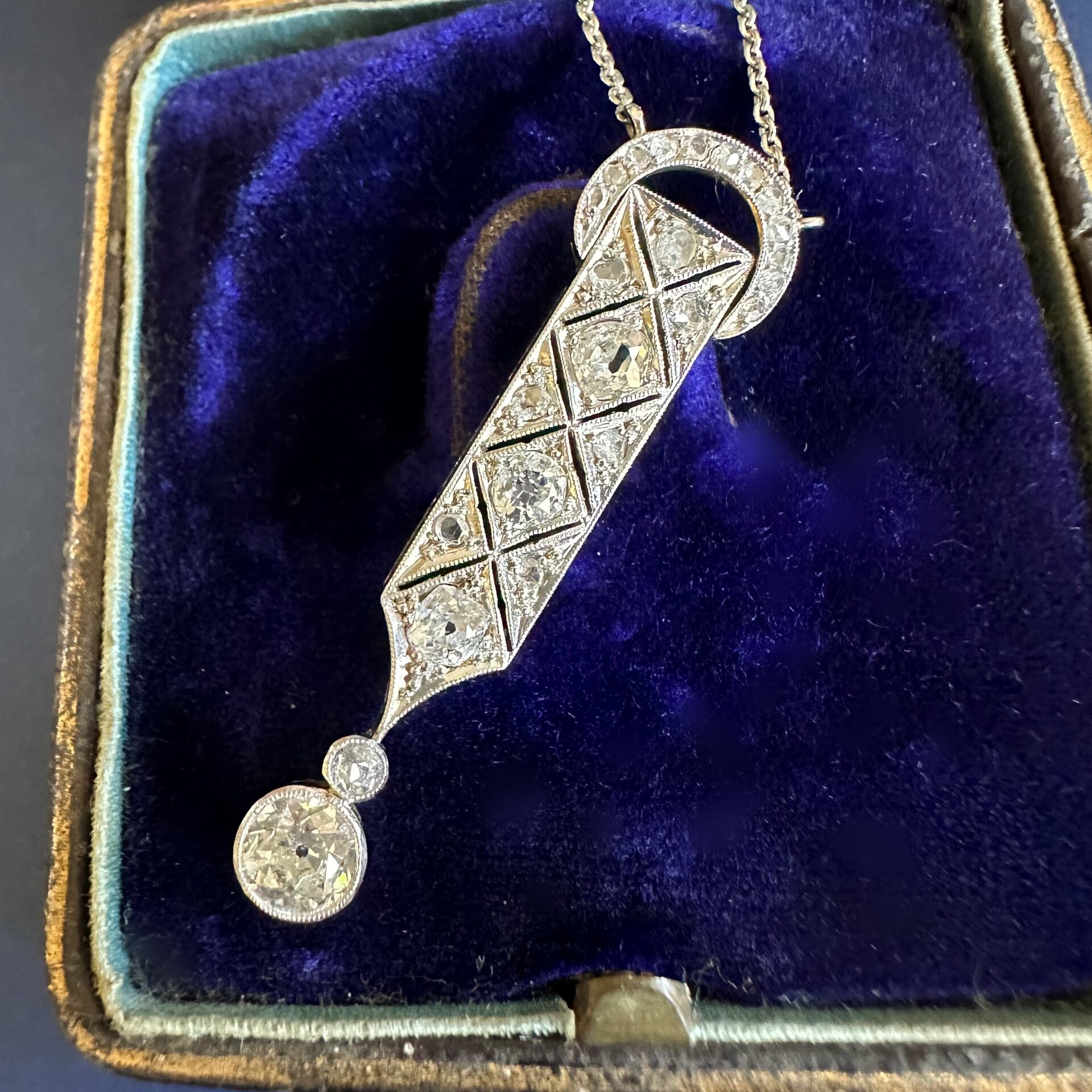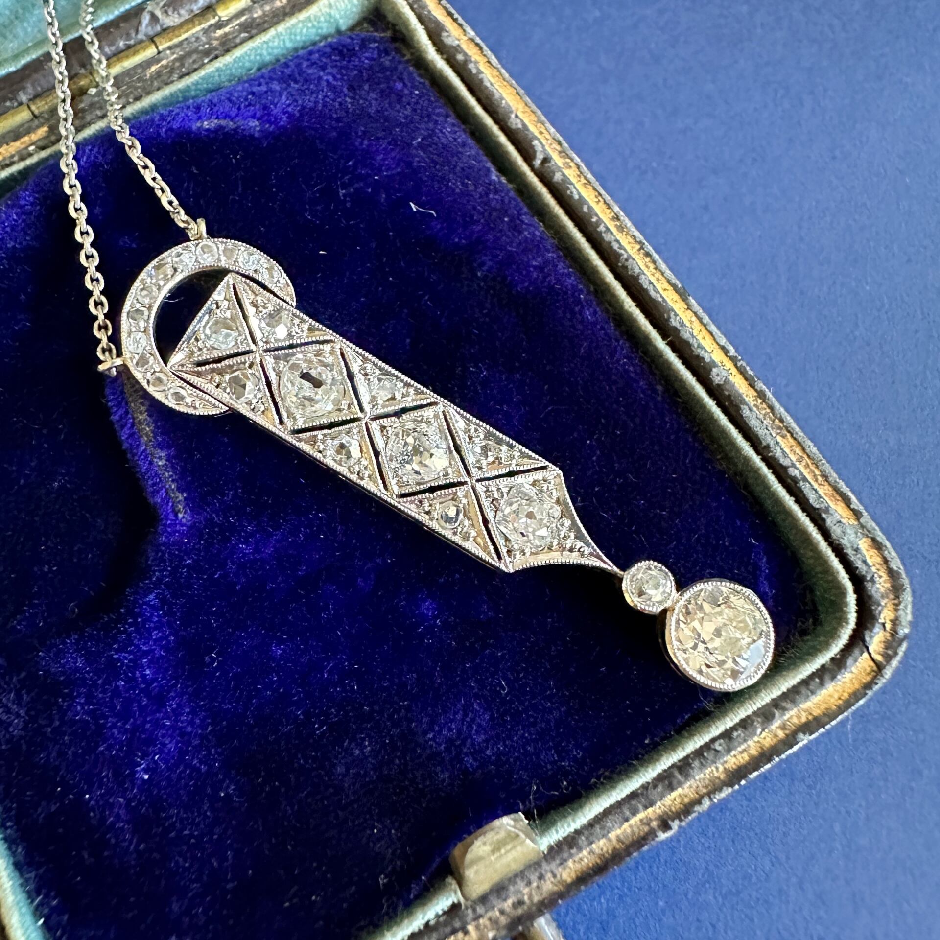 そしてこのペンダントのデザインは、時代の移行を感じさせる幾何学的な模様が見事に融合しています。アールデコ時代のシンメトリーと直線美を思わせる一方で、ベルエポック時代の華やかさも残しているのです。