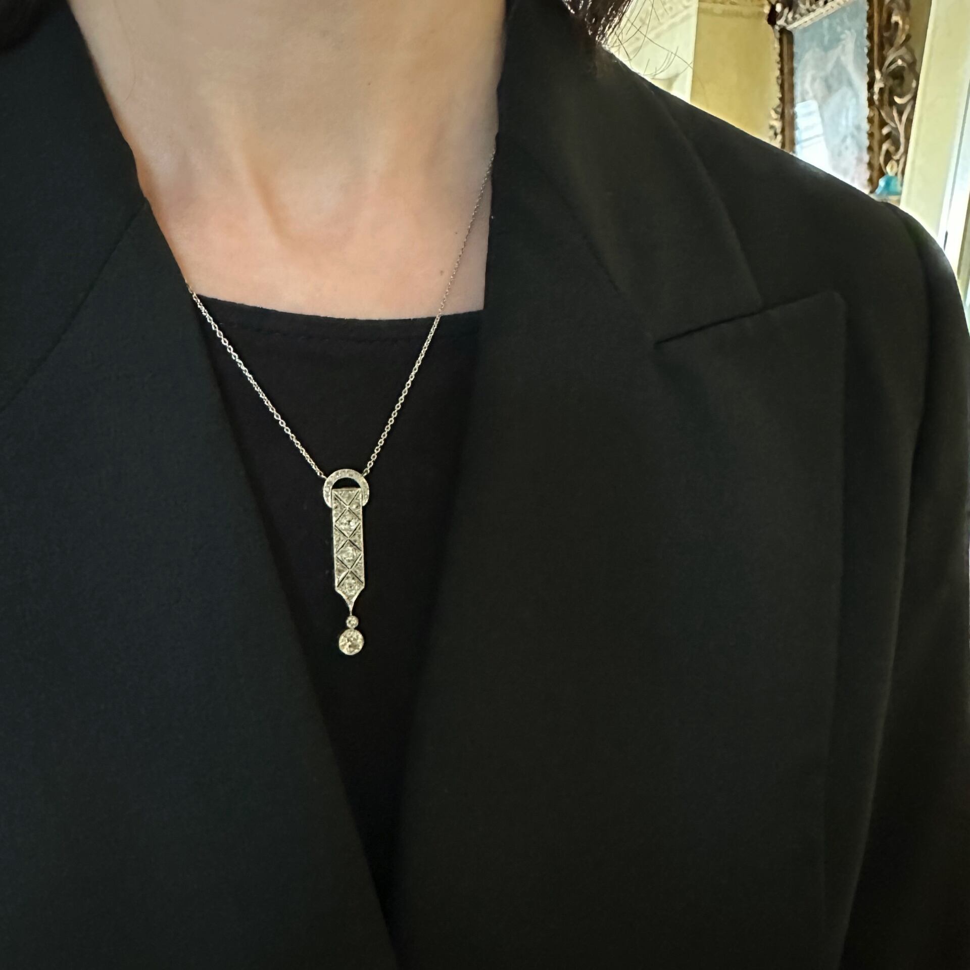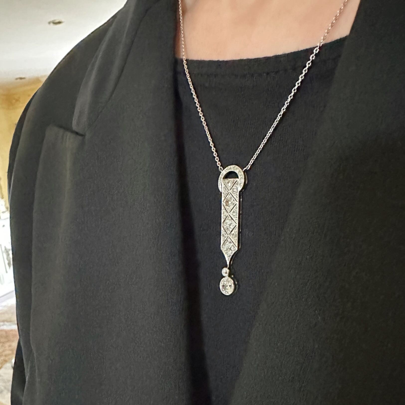 直線的なラインと菱形の配置は、アールデコの特徴であるシンメトリカルな美しさを強調しつつ、全体のバランス感覚が絶妙です。下部に向かうにつれて緩やかに細くなる形状は、ペンダントの重心を低くし、着ける人の首元を優雅に引き締めます。特に、下部にセットされた大きなダイヤモンドが、まるで重力に引かれるかのように美しいバランスを保ち、全体のデザインに動きを与えています。つまりその動きによってダイヤモンドが絶えず異なる光を反射して、このわずかな動きが、ペンダント全体に生命力を与え、着ける者の動きに合わせて優雅に輝くのです。