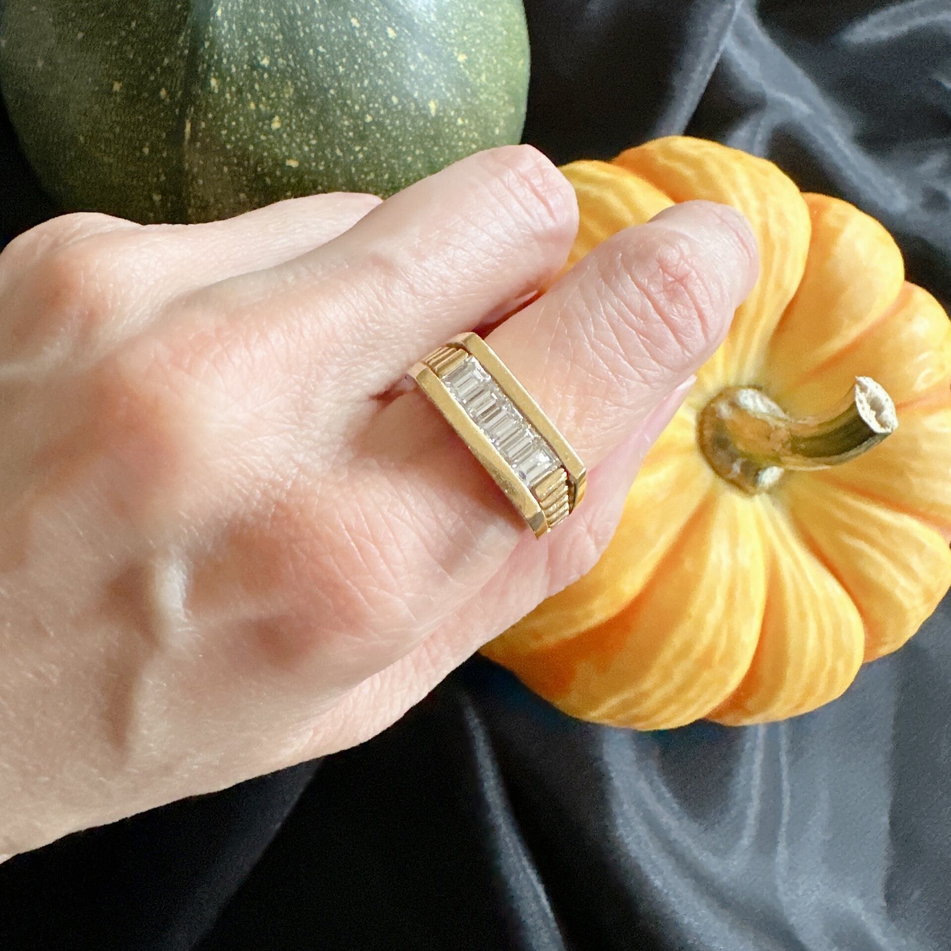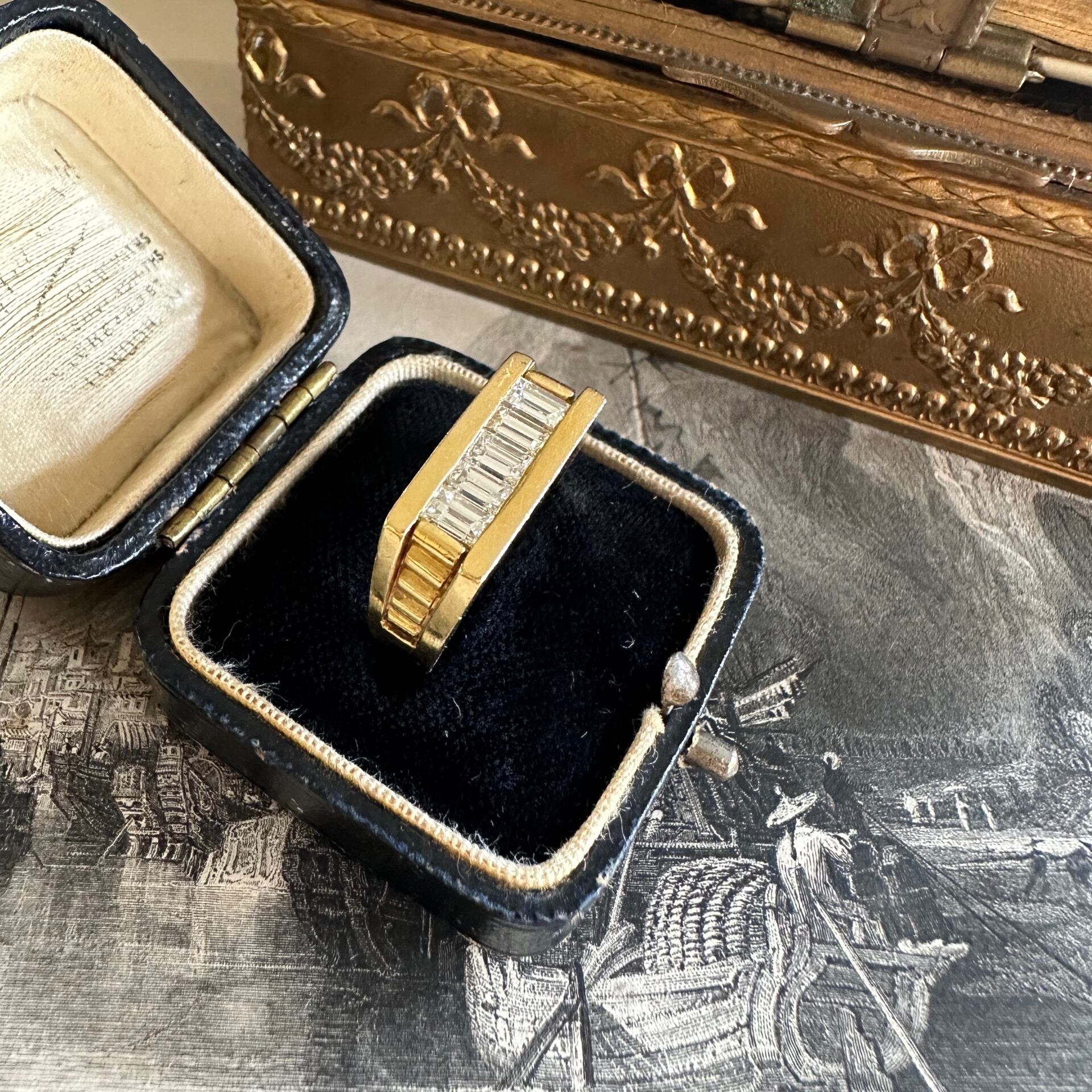 重厚なゴールドと輝くバゲットカットダイヤモンドが融合したデザインは、当時のアメリカ社会における経済的繁栄とモダンデザインの追求を感じ、同時に、今の時代でもその美しさとタイムレスな魅力を失わず、クラシックでありながら現代のファッションにも溶け込むひと品なのではないでしょうか。