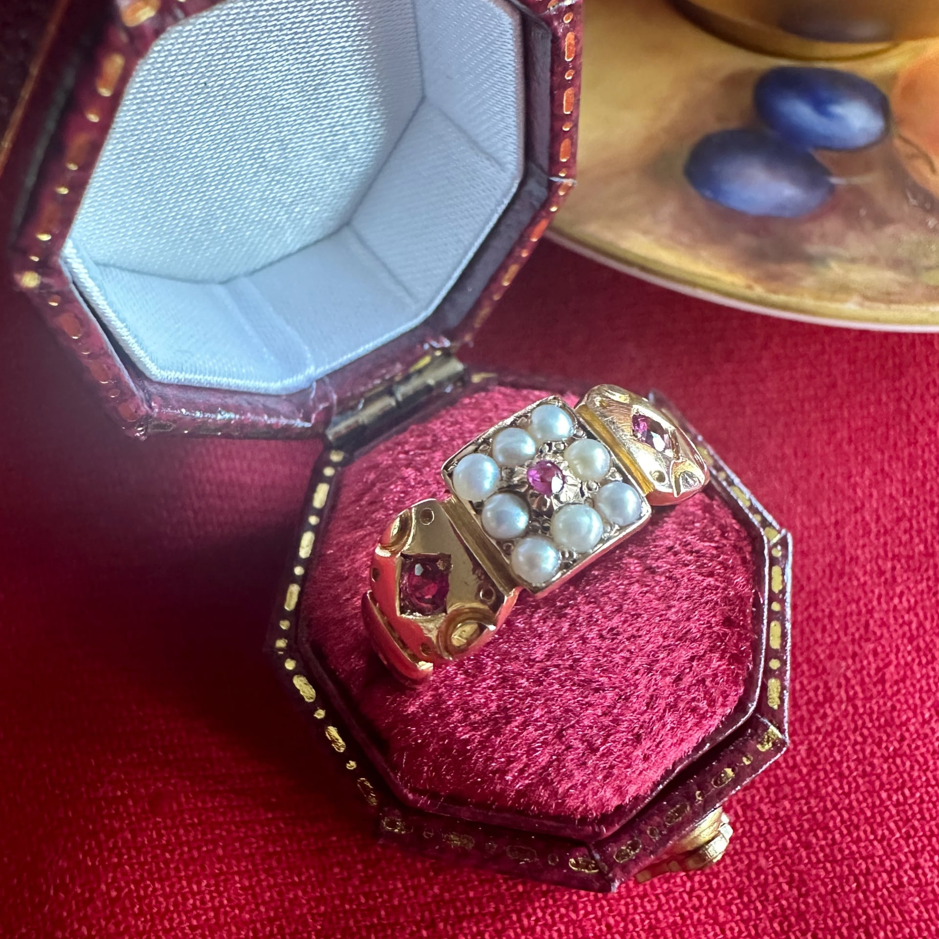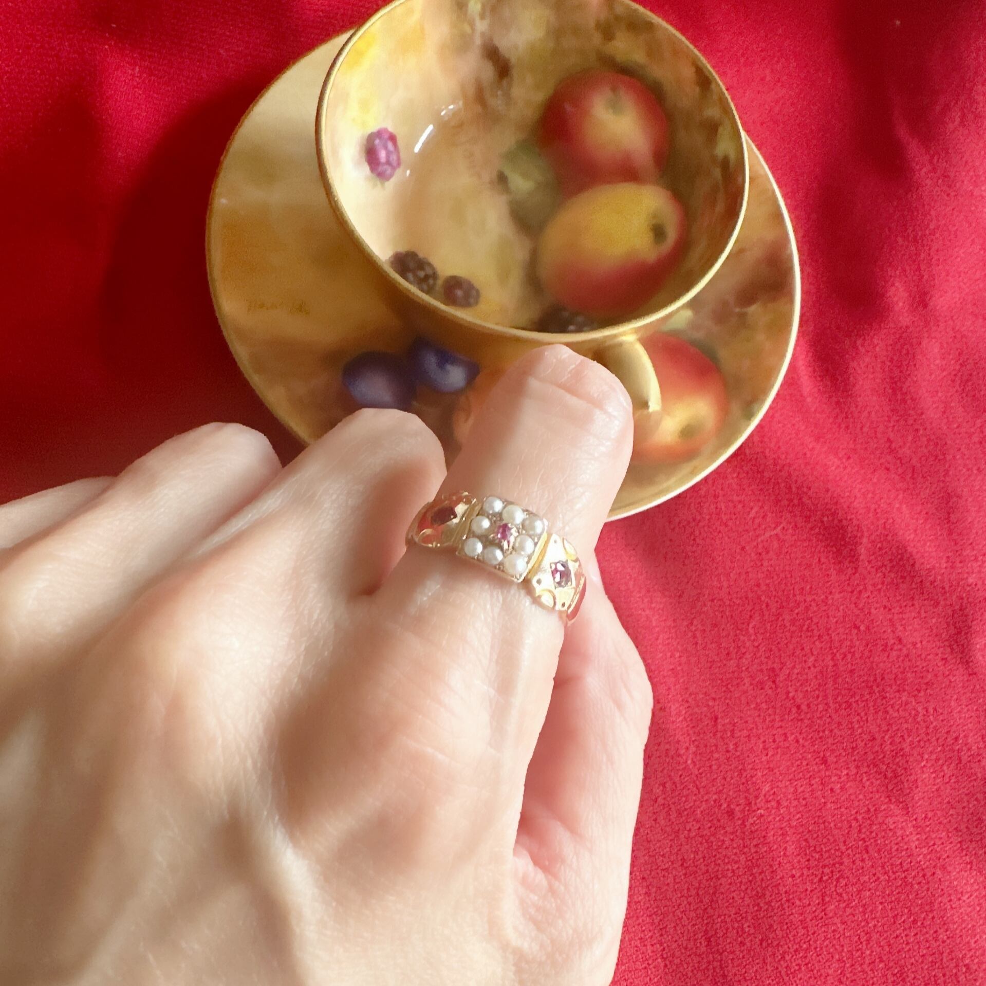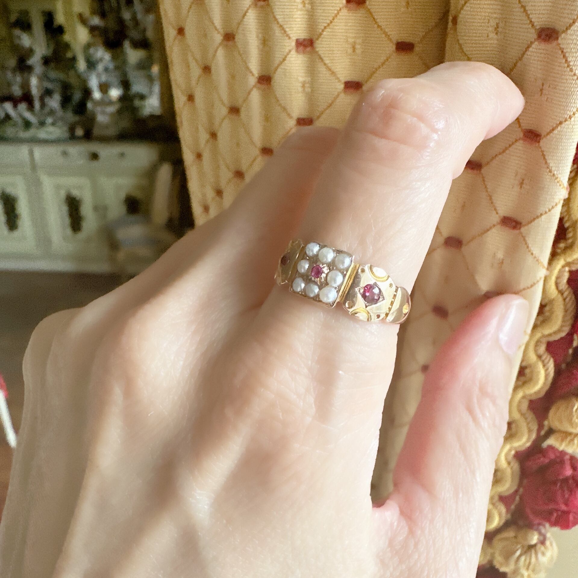 ルビーを囲むように並べられたハーフパールは、一粒一粒が丁寧にセットされており、天然素材ならではの微妙な個性が感じられます。どのパールもふっくらとした形をしていて、穏やかで清楚な輝きがリング全体に優雅な雰囲気を与えています。当時はパールがとても貴重で高価だったことを思うと、このリングが持つ歴史の重みがさらに心を惹きつけます。