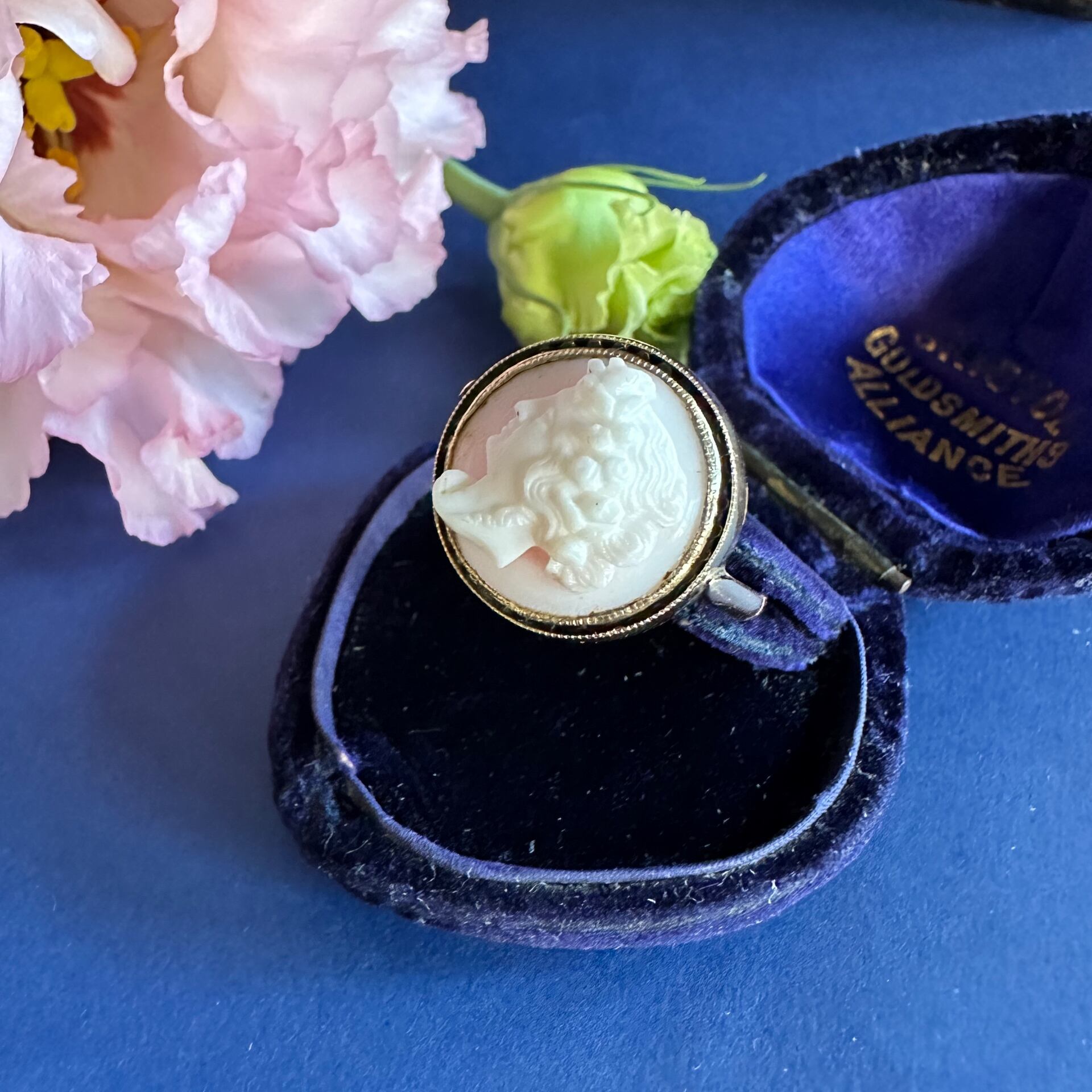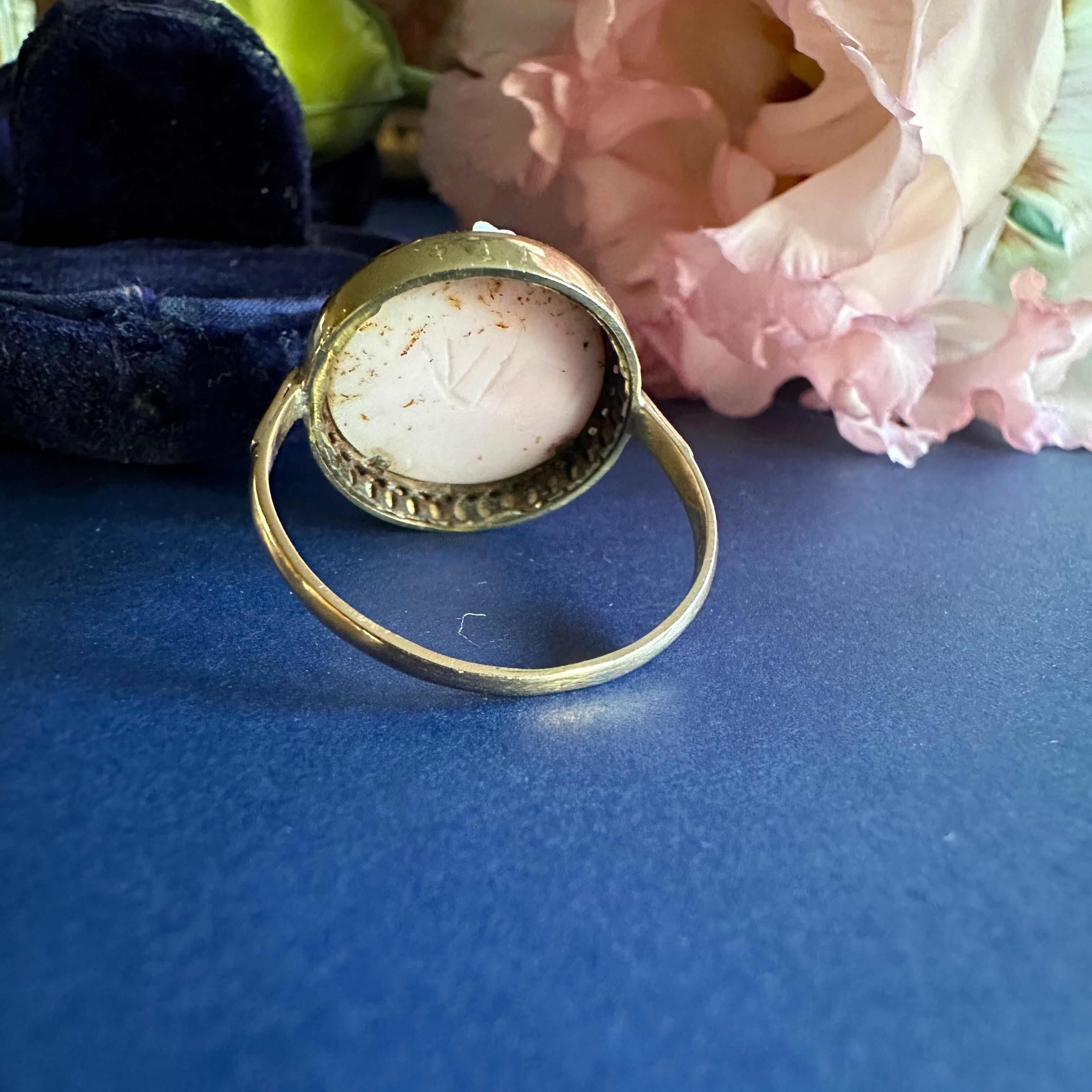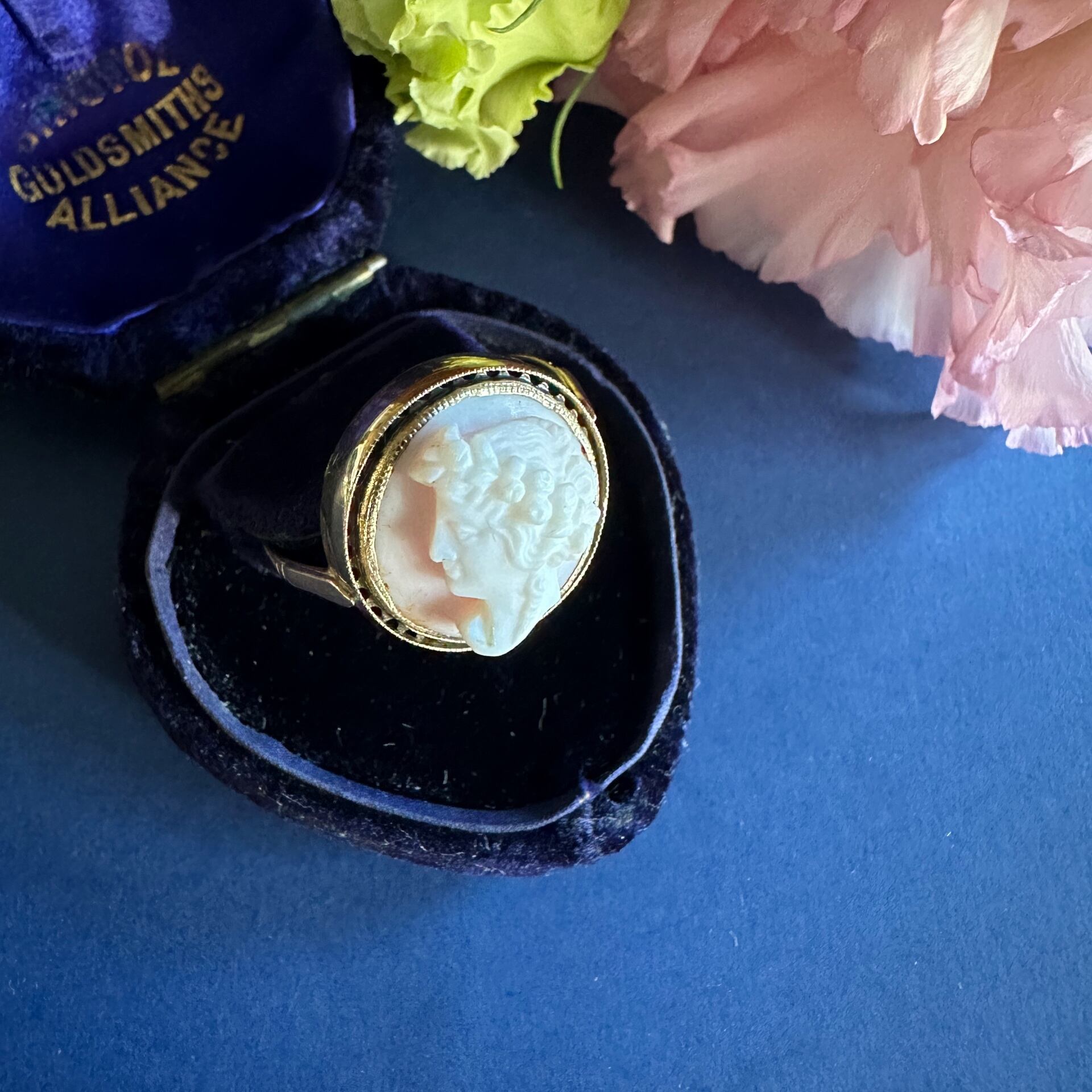 ヴィクトリア時代には、その優雅な色彩と質感が特に愛され、ジュエリーとして多くの女性の憧れを集めました。このリングのカメオには、古代ローマ神話の花と春の女神「ラフローラ」と思われる女性像が彫られていて、彼女の穏やかな表情と頭上に飾られた花冠が、生命の再生と自然の恵みを象徴しています。