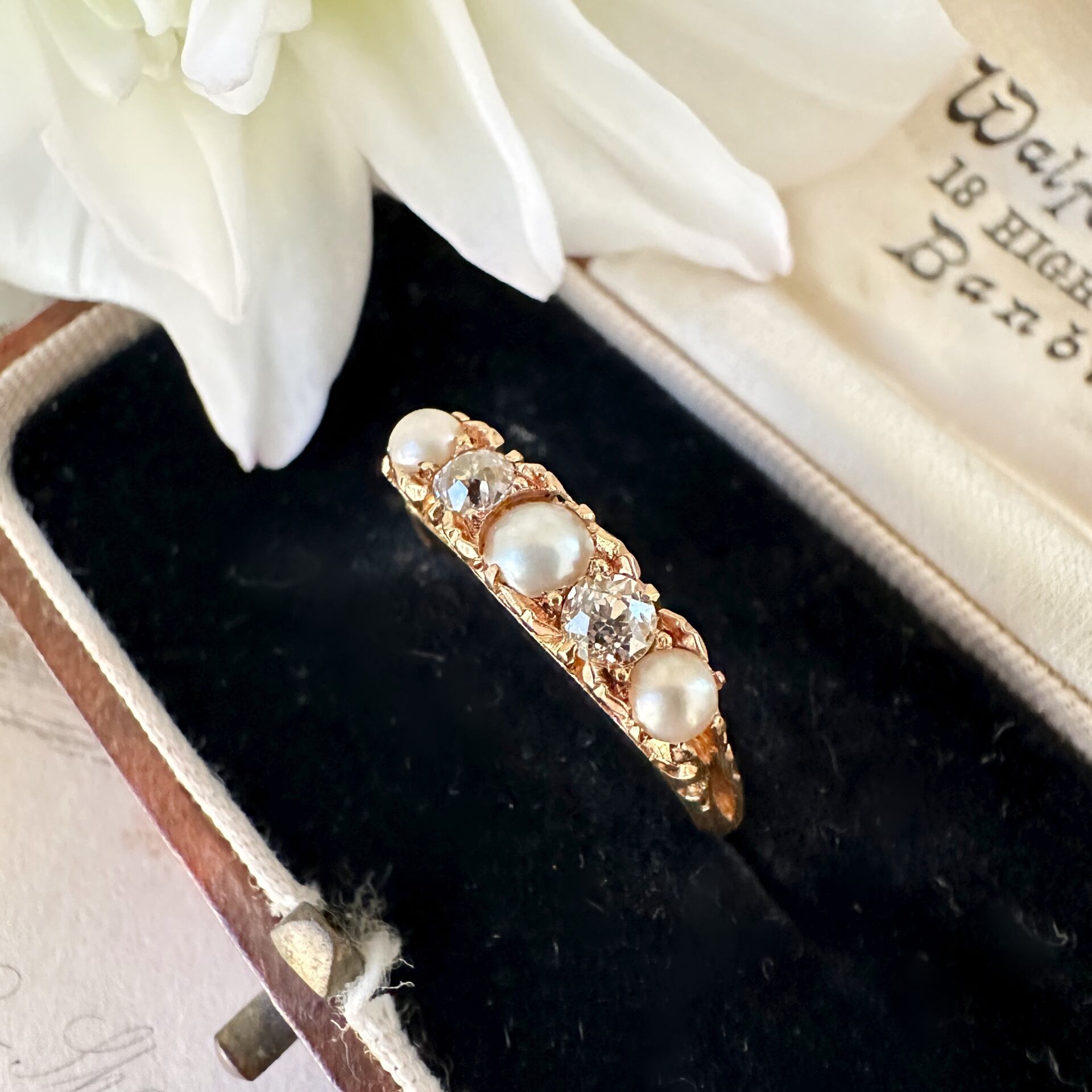 オールドヨーロピアンカットダイヤモンドと天然パールをあしらったこのアンティークファイブストーンリングは、時代の趣を色濃く映し出すひと品なのではないでしょうか?