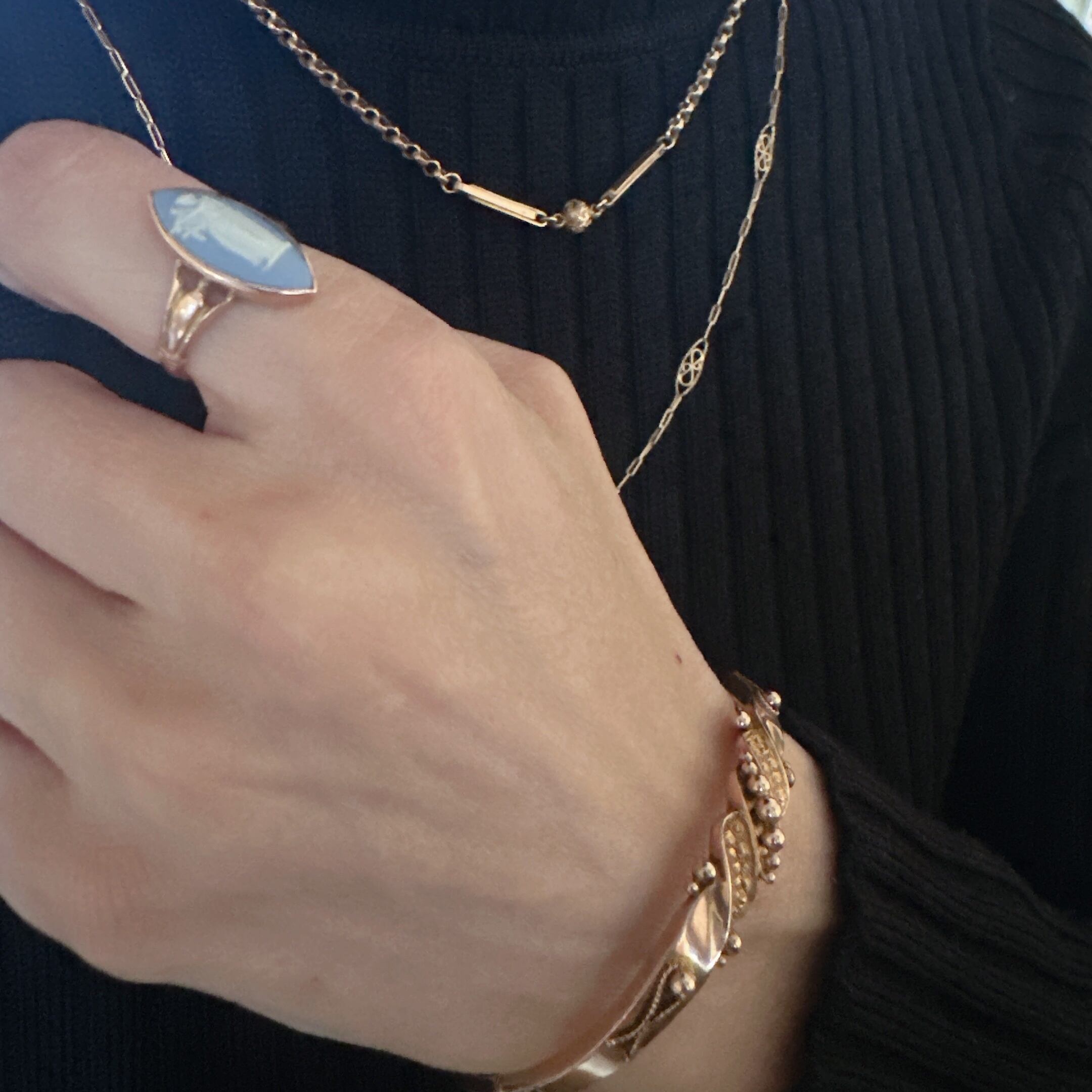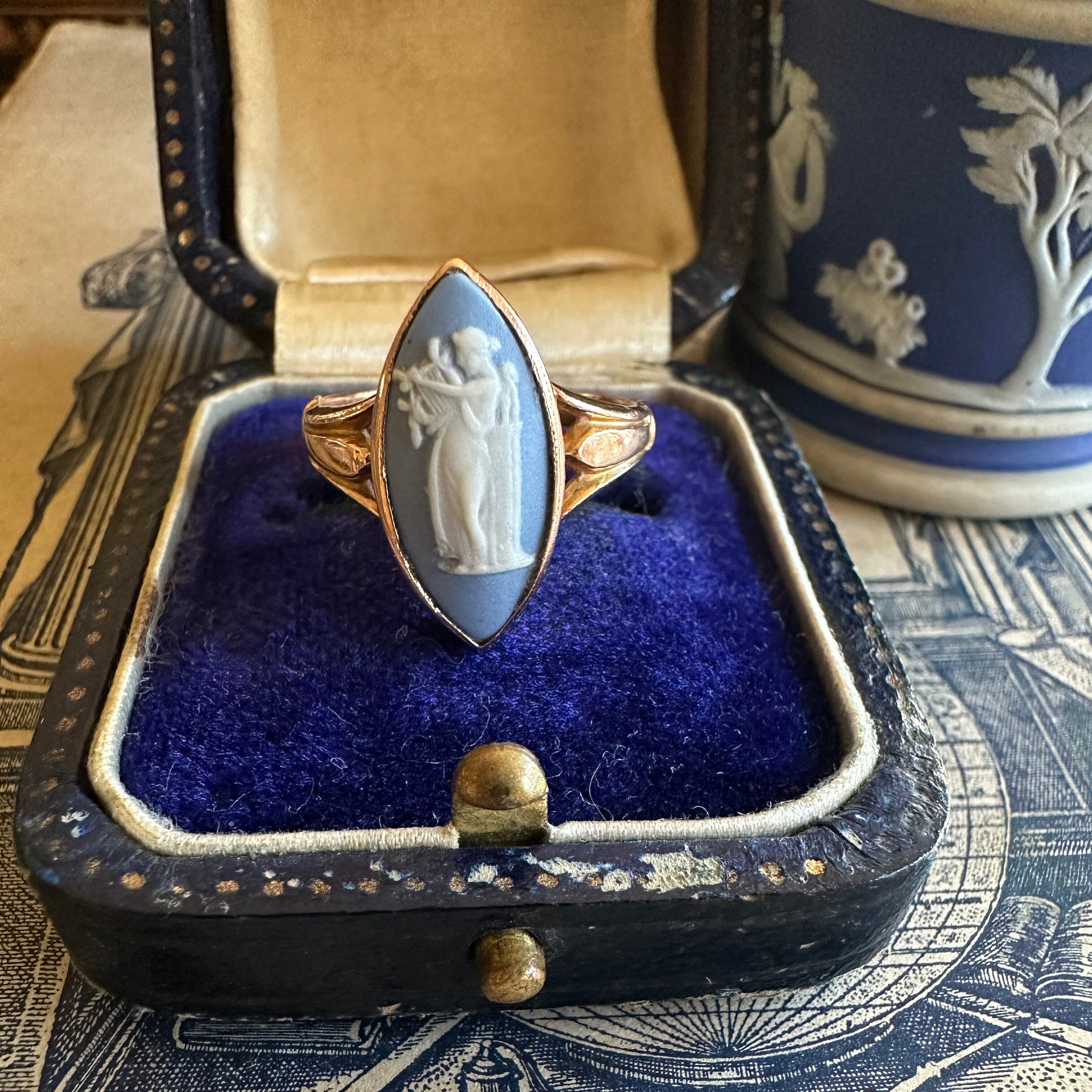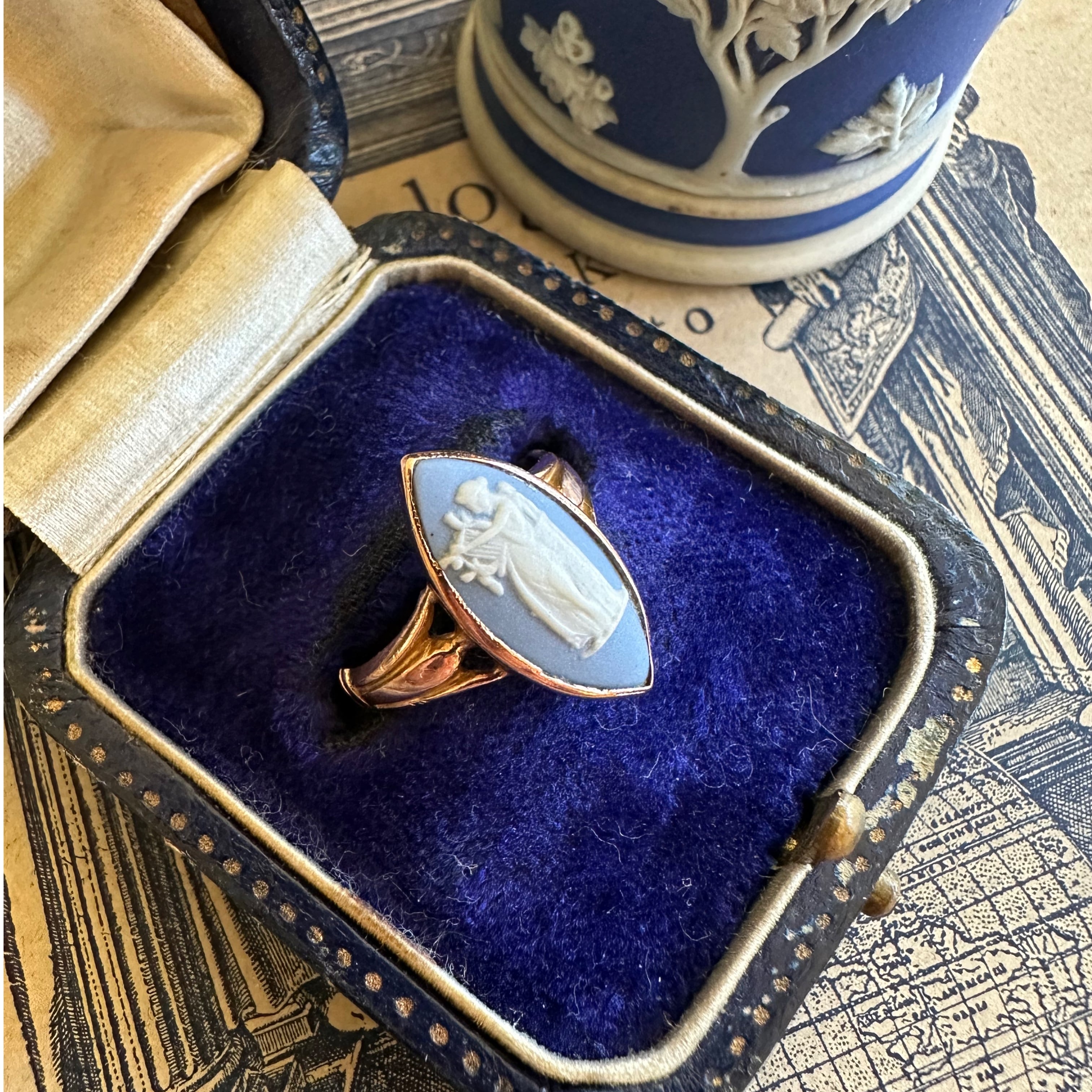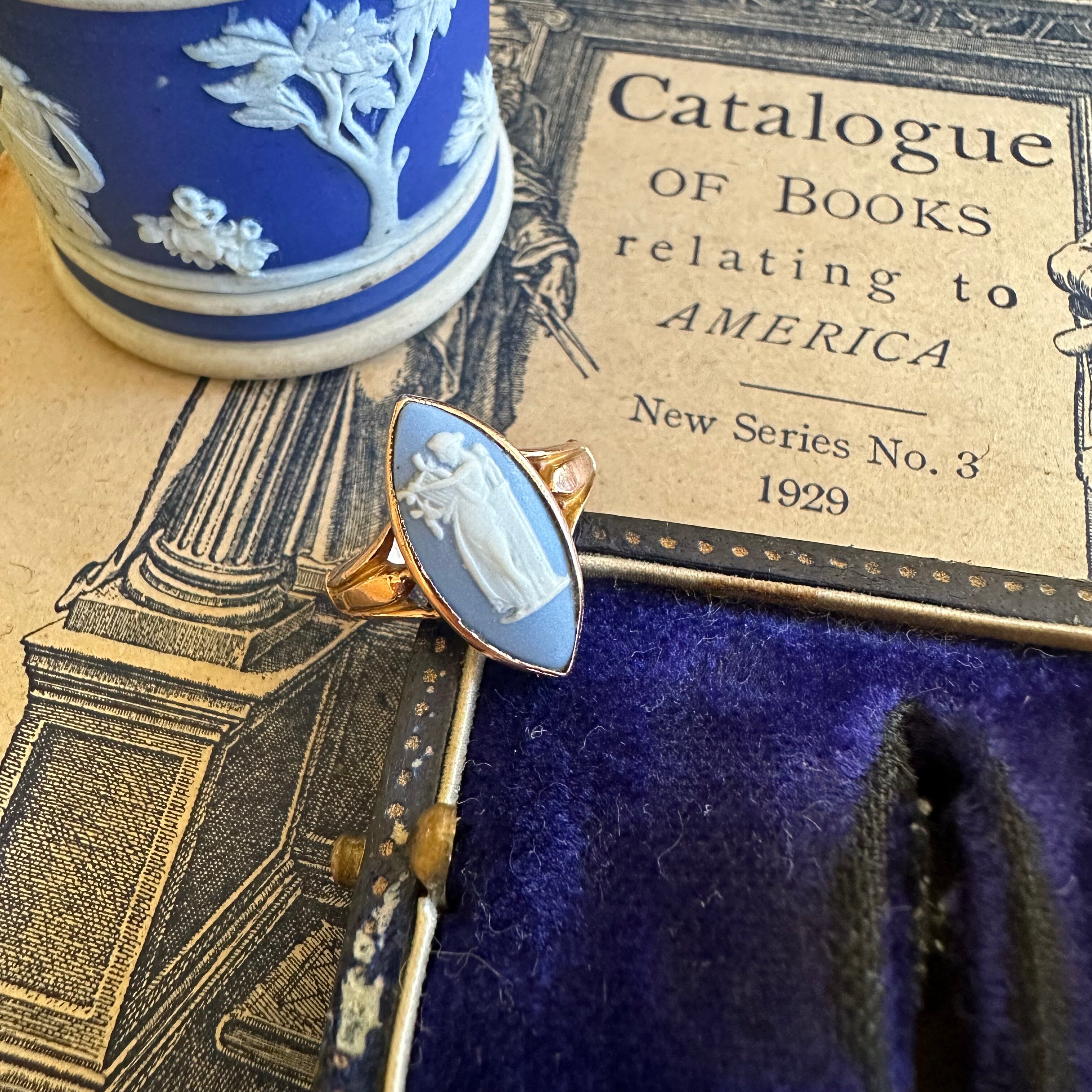 この1919年チェスターのホールマークを持つウェッジウッドリングは、ウェッジウッド特有の柔らかな淡いブルーと繊細に浮き彫りされた白いレリーフが魅力的なひと品です。