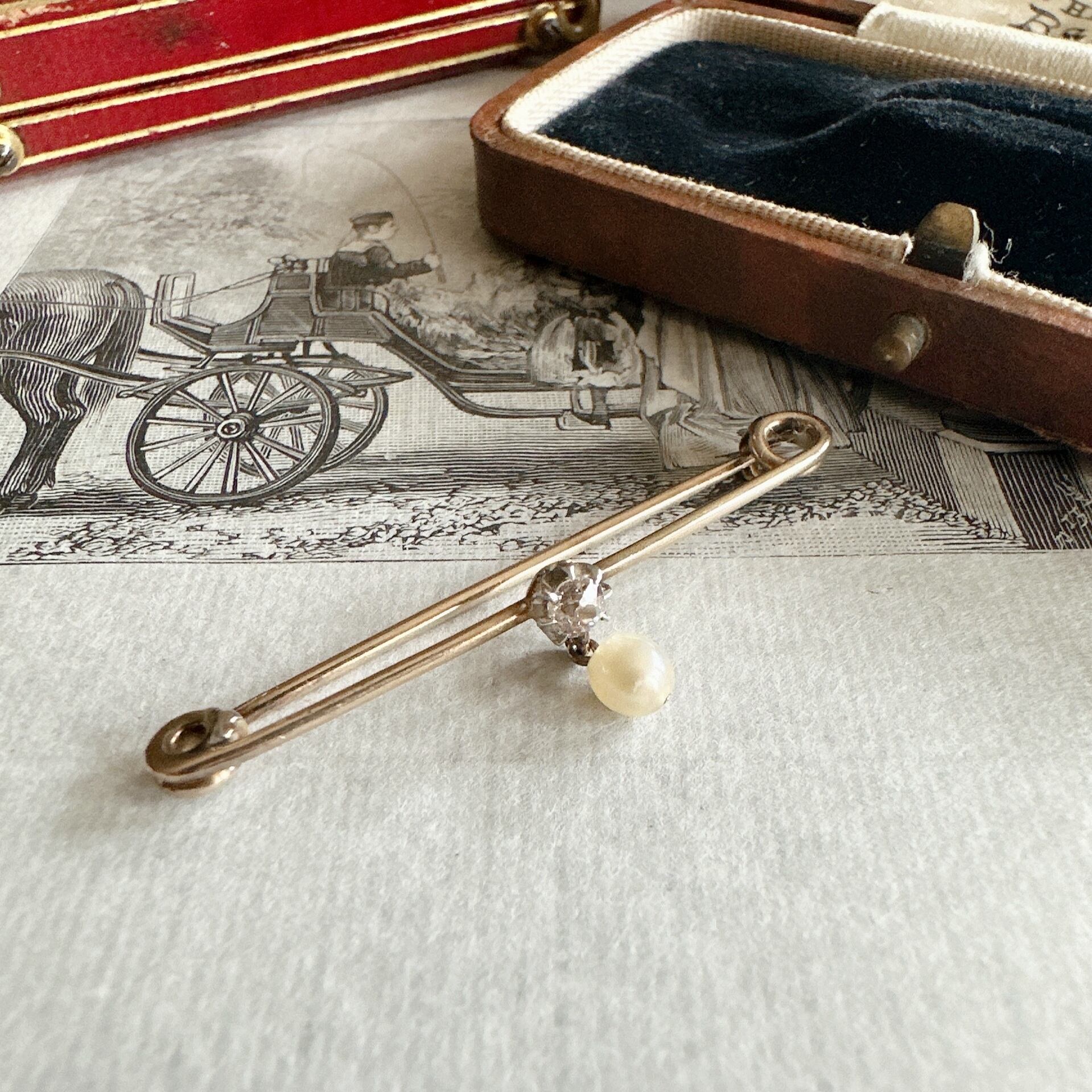 オールドヨーロピアンカットダイヤモンドと小さなパールが添えられたバーブローチは、まるで水平線のように端正で静かな美しさを湛えたひと品に感じます。