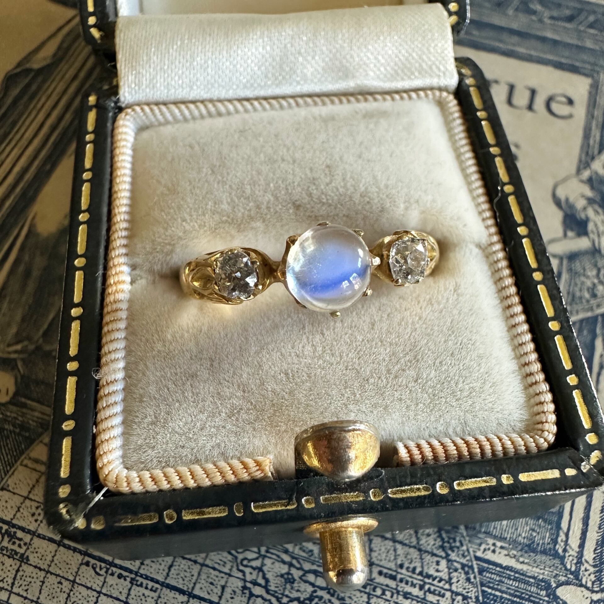 ムーンストーンを挟むようにセットされたオールドカットダイヤモンド(一つはヨーロピアン、一つはマイン)は、現代の機械的なカットとは一線を画す、手作業ならではの温もりと個性を感じさせます。