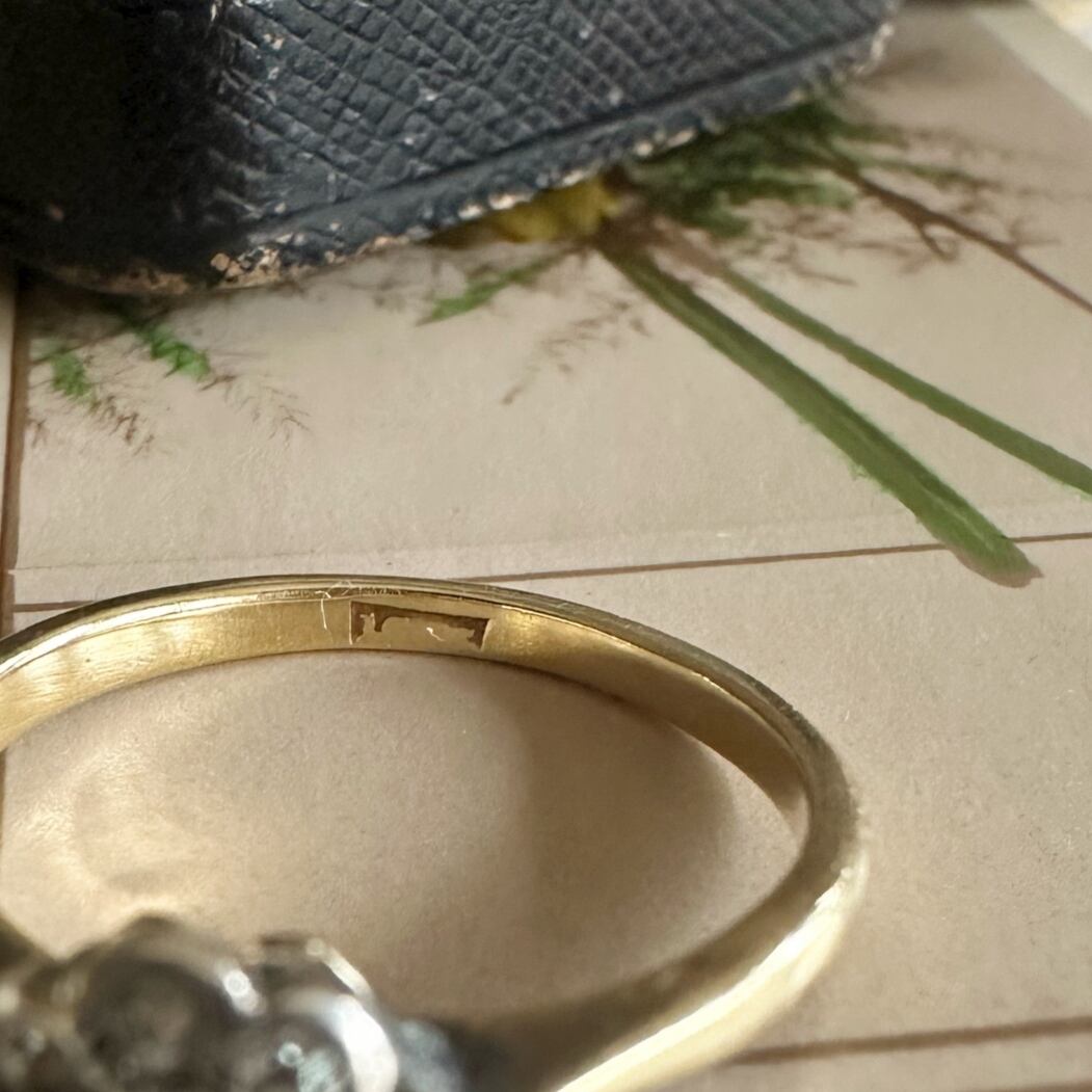 ダイヤモンドを抱くセッティングはシルバー製。これはアンティークジュエリーならではの特徴で、かつてプラチナが普及する以前、ダイヤモンドの輝きを最大限に引き出すためにシルバーが用いられていました。