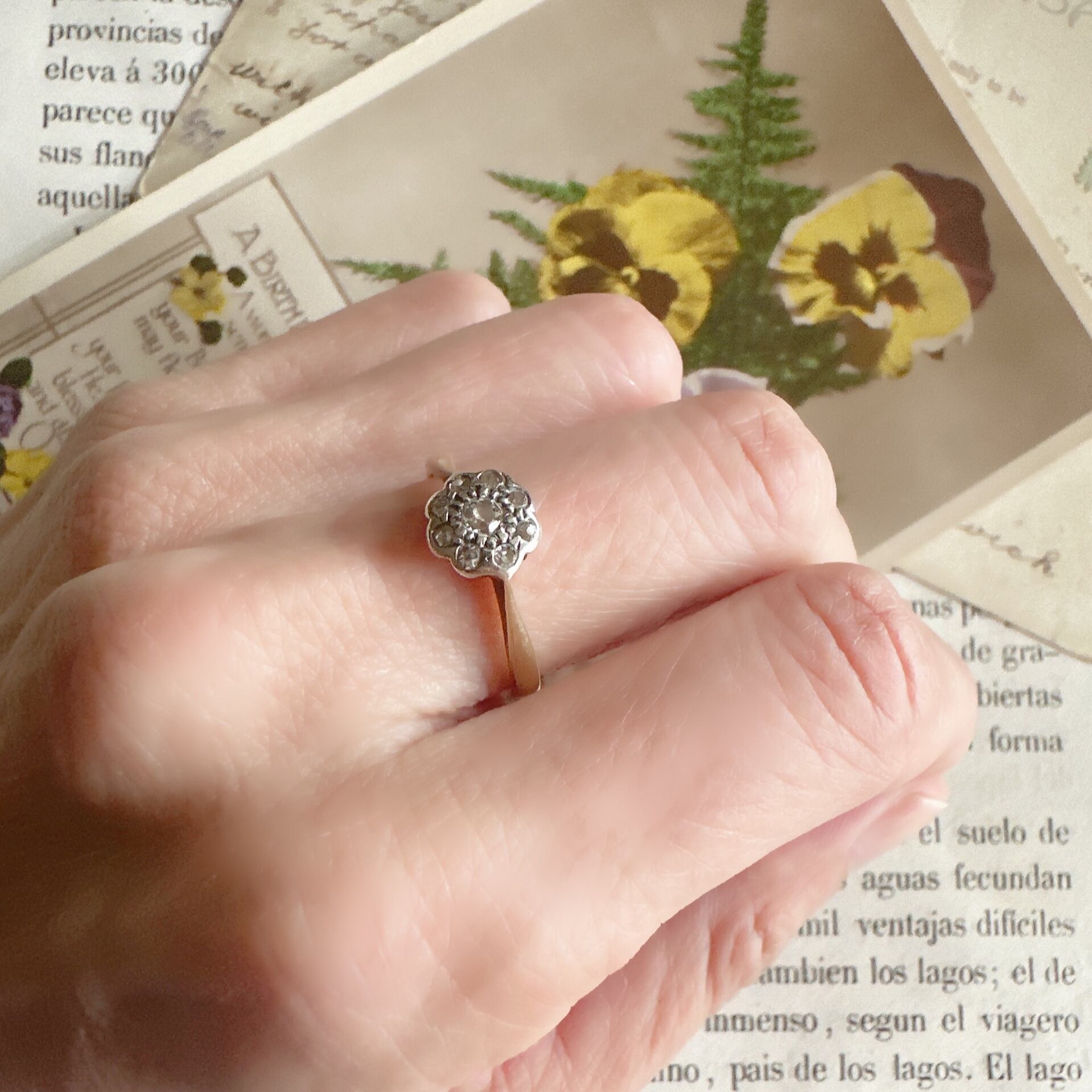オールドカットダイヤモンドが集められた花形のセッティングは愛らしく、光を受けるたびに柔らかくひっそりと輝きます。