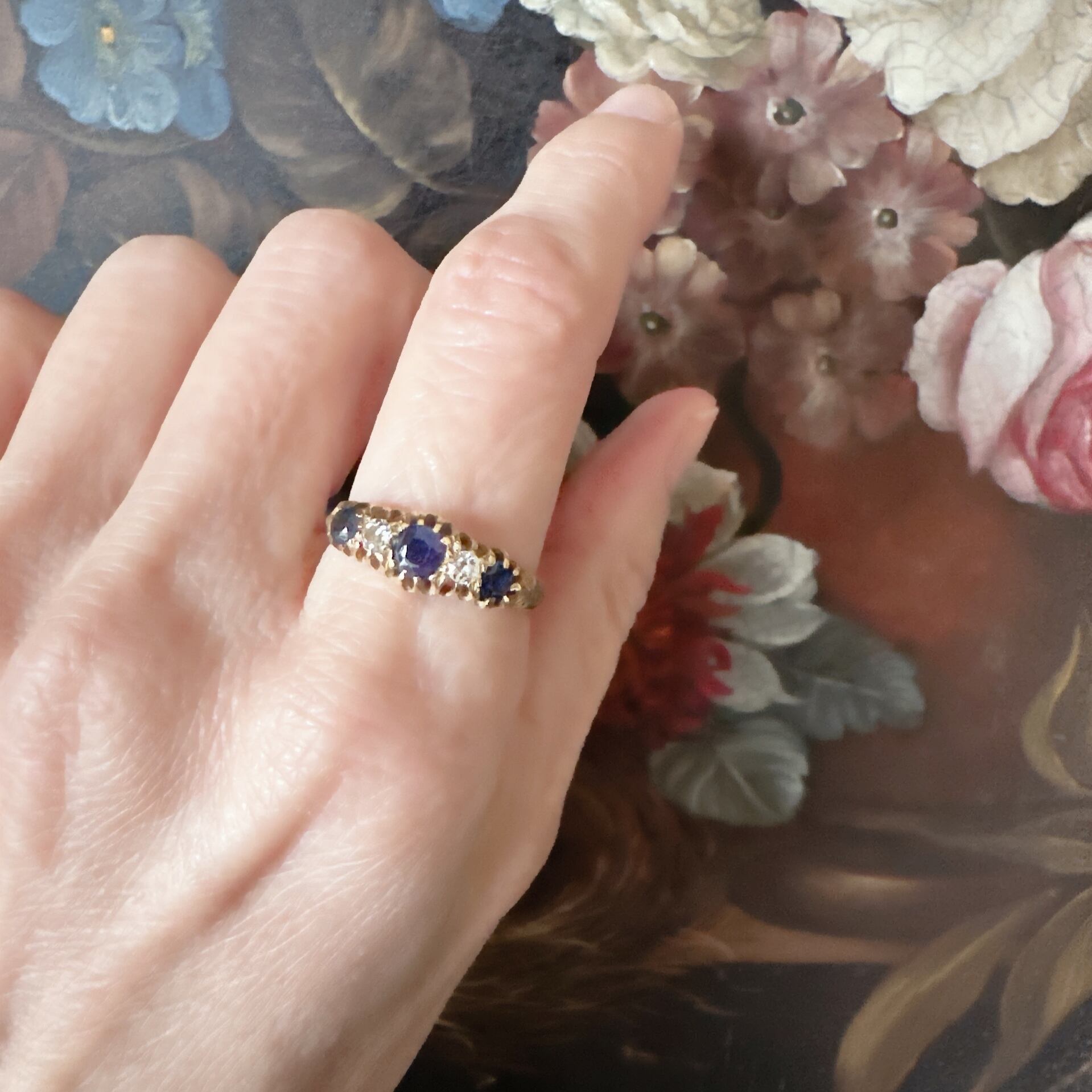 18金ゴールドのアンティークならではの落ち着いた色味が、サファイアとオールドカットダイヤモンドを包み込むように優しく輝き、長い時を経たからこその温もりを感じさせます。