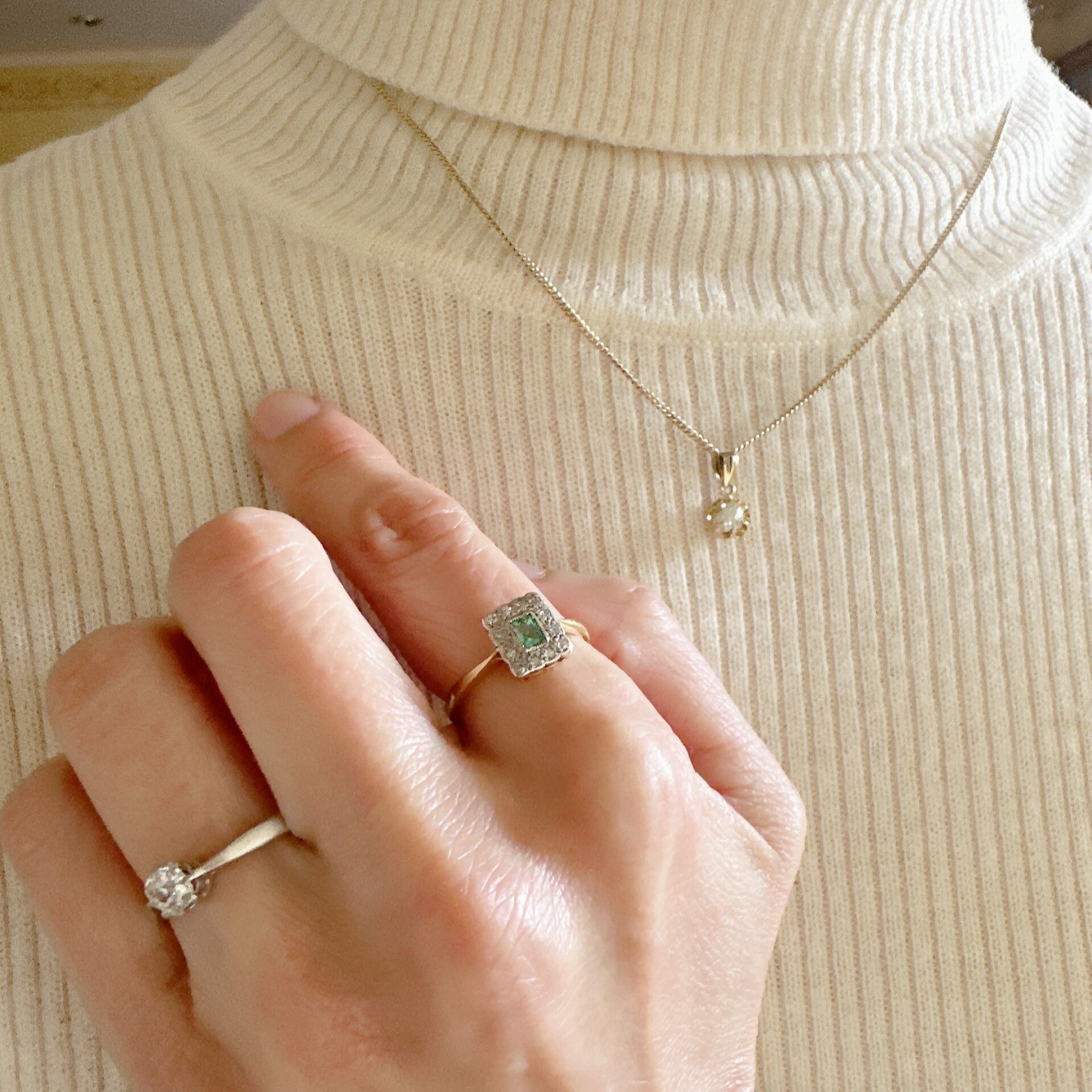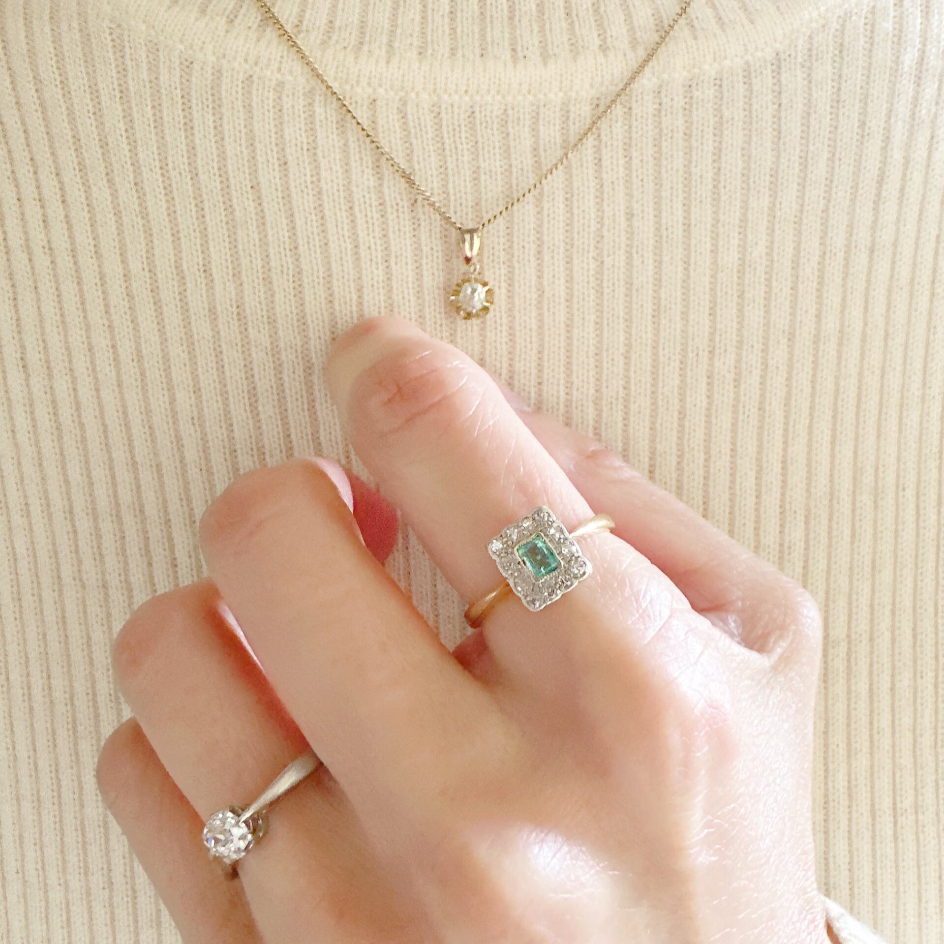 ※ 100年以上前の古いお品になりますので、経年によるアンティーク品特有の微小なスレなどルーペで見てわかる程度にございます。ダイヤモンドはルーペでのぞくと内包物はありますが、肉眼でみえるものではなく、瑞々しい輝きを楽しませてくれます。カケはございません。